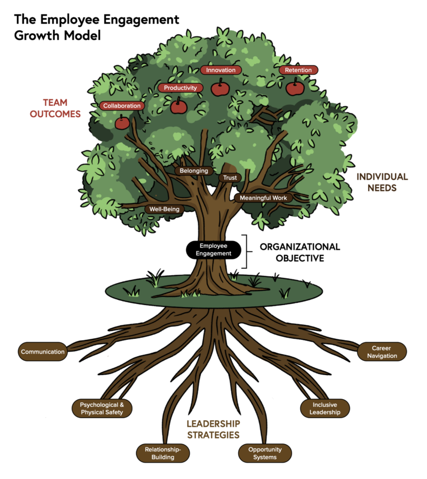 The Employee Engagement Growth Model (EEGM) gives executives and leadership teams a framework to achieve financial and business goals by creating an environment where individual employees thrive. It blends relationships and care with productivity and clarity to create outcomes that generate sustainable success for organizations. It’s important to view employee engagement as a dynamic ecosystem, with each element supporting another. The tree motif reminds leaders that engagement must be consistently cultivated, nourished by intentional leadership strategies. The needs of employees also change, evolving over time and reacting to outside influences that effect performance.